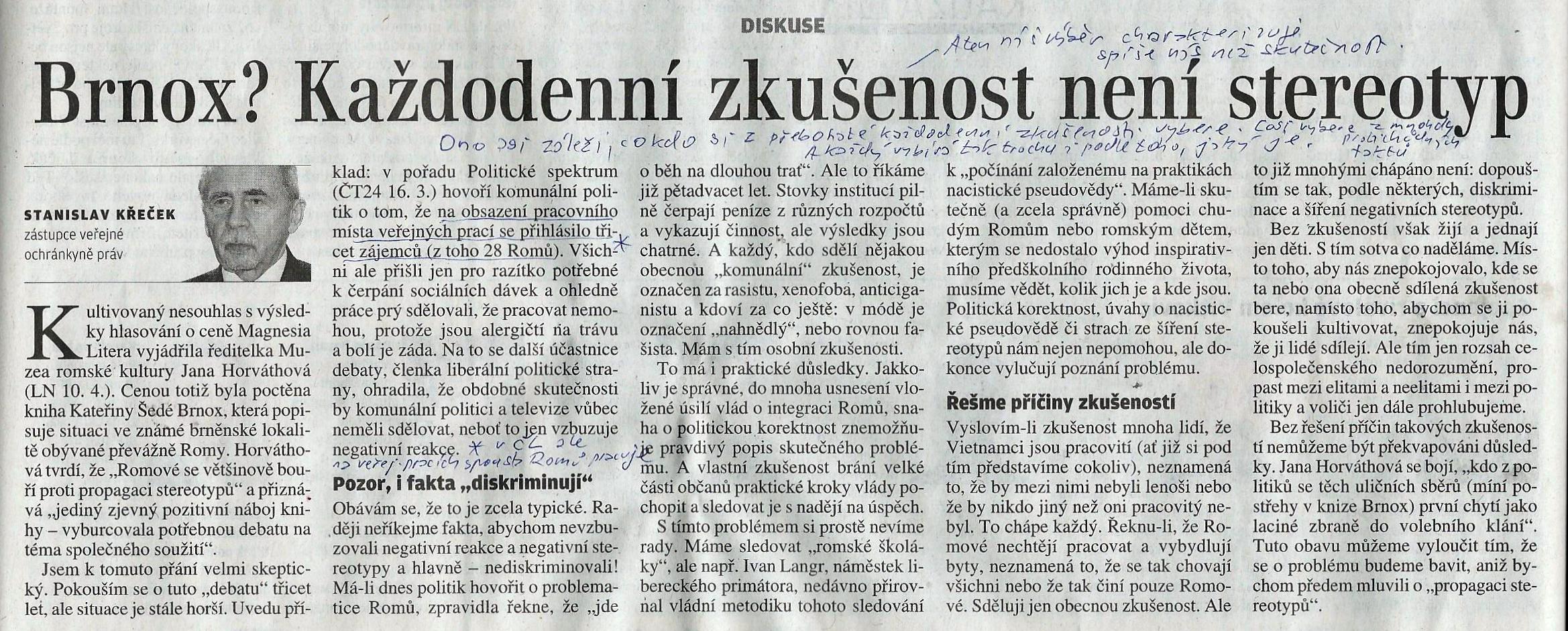 „…každý, kdo sdělí nějakou obecnou“komunální“ zkušenost, je označen za rasistu, xenofoba, anticiganistu a kdo ví za co ještě…“, píše zástupce veřejné ochránkyně práv v článku „Brnox? Každodenní zkušenost není stereotyp“ (LN 18. 4.). A jako důkaz té každodenní zkušenosti si vybral informaci z televizního pořadu Politické spektrum na ČT 24 z 6. března. Prý „na obsazení pracovního místa veřejných prací se přihlásilo třicet zájemců (z toho 28 Romů). Všichni ale přišli jen pro razítko potřebné k čerpání sociálních dávek“.