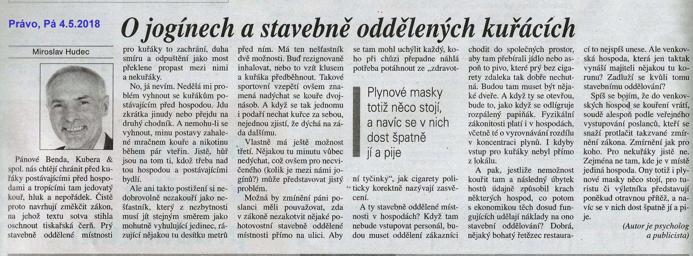 Pánové Benda jr., Kubera & spol. nás chtějí chránit před kuřáky postávajícími před hospodami a tropícími tam jedovatý kouř, hluk a nepořádek. Čistě jen proto navrhují změkčit zákon, na jehož textu sotva stihla oschnout tiskařská čerň. Prý stavebně oddělené místnosti pro kuřáky to zachrání, duha smíru a odpuštění jako most překlene současnou propast mezi nimi a nekuřáky.