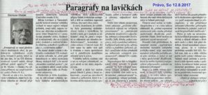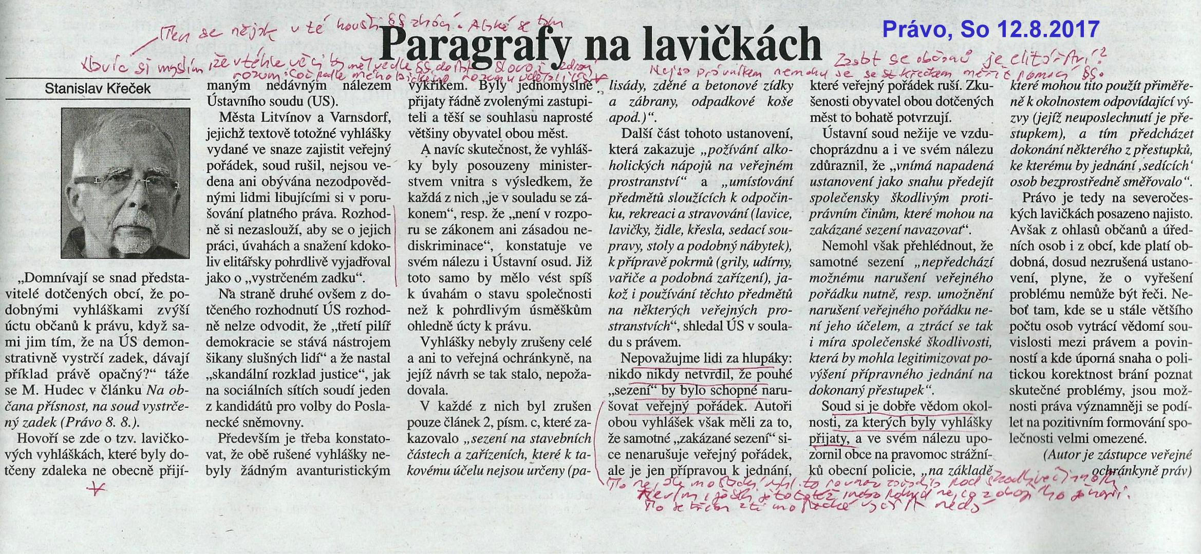 Nejsa právníkem těžko se mohu rovnocenně postavit Stanislavu Křečkovi k fechtování na barikádě z paragrafů („Paragrafy na lavičkách“? Právo 12. 8.). Na barikádě hájící vyhlášky, jejichž právně pochybný a místy i šikanózní charakter konstatoval samotný Ústavní soud. Na druhé straně, kdyby si byl pan doktor jist dostatečnou pevností své paragrafové barikády, cítil by takovou potřebu podšprajcnout ji pro jistotu čistě emotivními obraty (pravda, značně již obnošenými) jako „elitářsky pohrdlivé“ či „pohrdlivé úsměšky“?